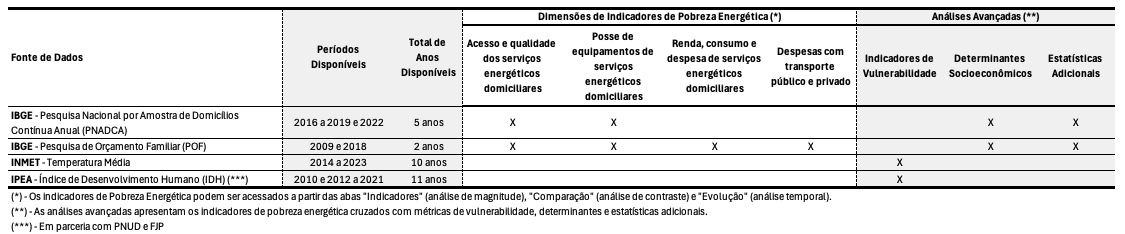A tabela a seguir sintetiza a disponibilidade de dados por base. Nela, é possível verificar os anos para os quais estão disponíveis as bases de dados originais consideradas neste estudo, bem como os tipos de indicadores de pobreza energética e análises avançadas que puderam ser desenvolvidos a partir dessas bases de dados para o OBEPE. Na seção de Metodologia, encontra-se a lista de todos os indicadores de pobreza energética, indicadores de vulnerabilidade, determinantes socioeconômicos e estatísticas adicionais calculados e monitorados pelo OBEPE.